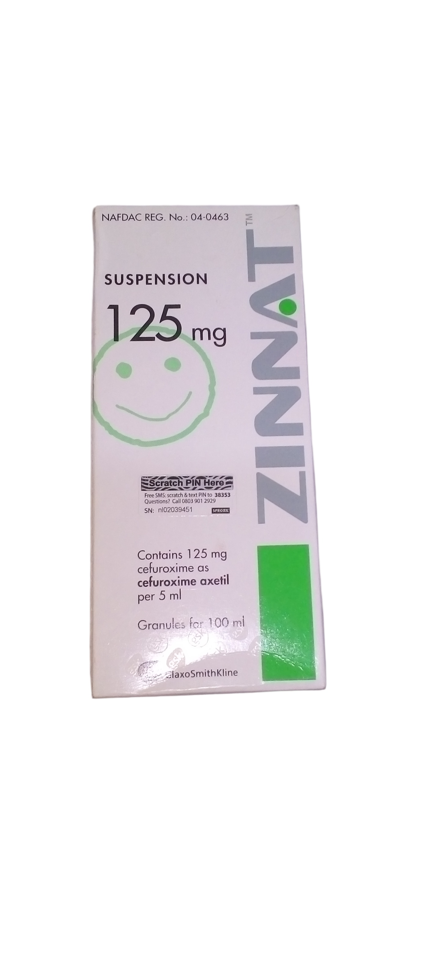 Zinnat (125mg/100ml) Suspension is an antibiotic medication containing cefuroxime axetil in liquid form, used to treat bacterial infections in children.